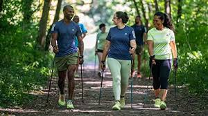 La marche nordique est une pratique de marche dynamique en pleine nature. Elle allie de manière idéale un travail d’endurance accessible à tous, la marche, et un renforcement musculaire de l’ensemble du corps.